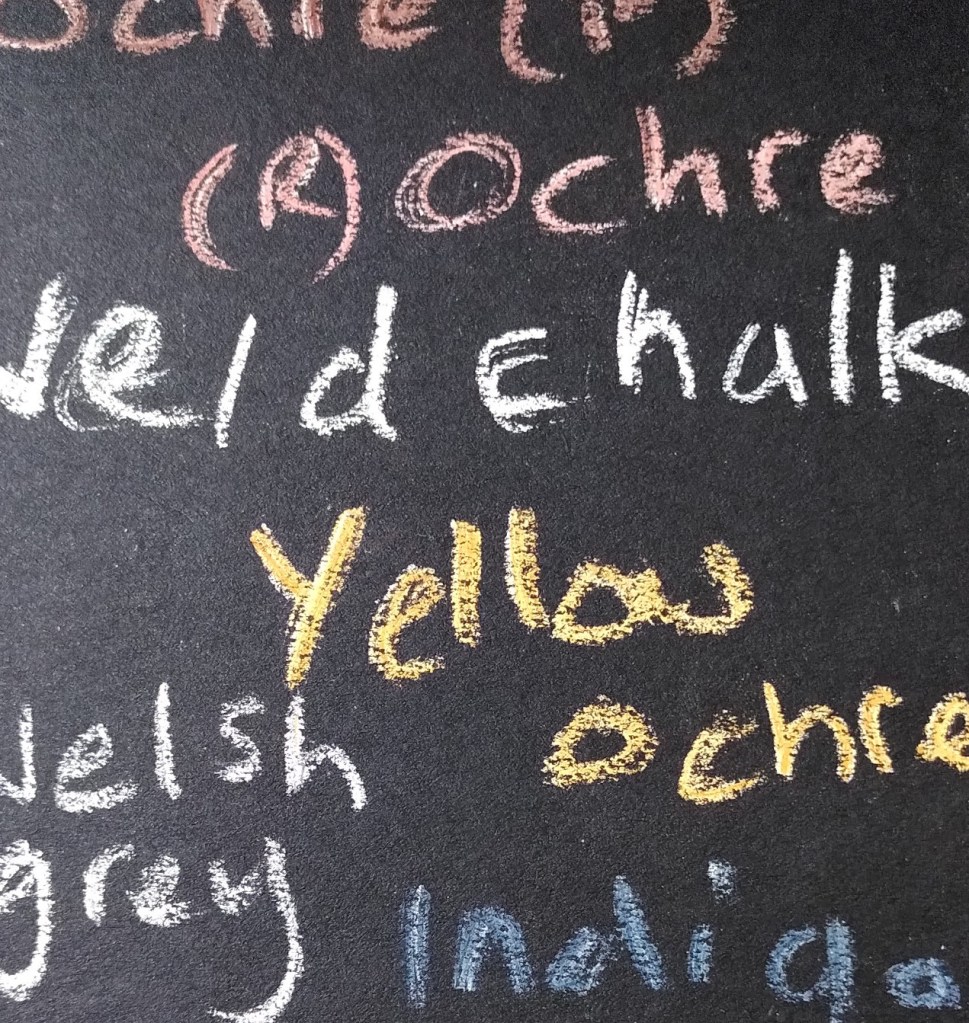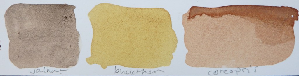 This gallery contains in images from experiments in making natural mineral and botanical pigments, inks and art materials. Materials shown here include walnuts, woad, turnsole, weld, ochre, chalk, gum tragacanth, buckthorn, coreopsis, slate, charcoal, oak gall, madder, field madder, dyer’s chamomile and willow.